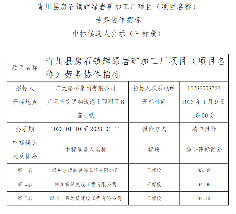 青川县房石镇辉绿岩矿加工厂项目(项目名称) 劳务协作招标中标候选人公示